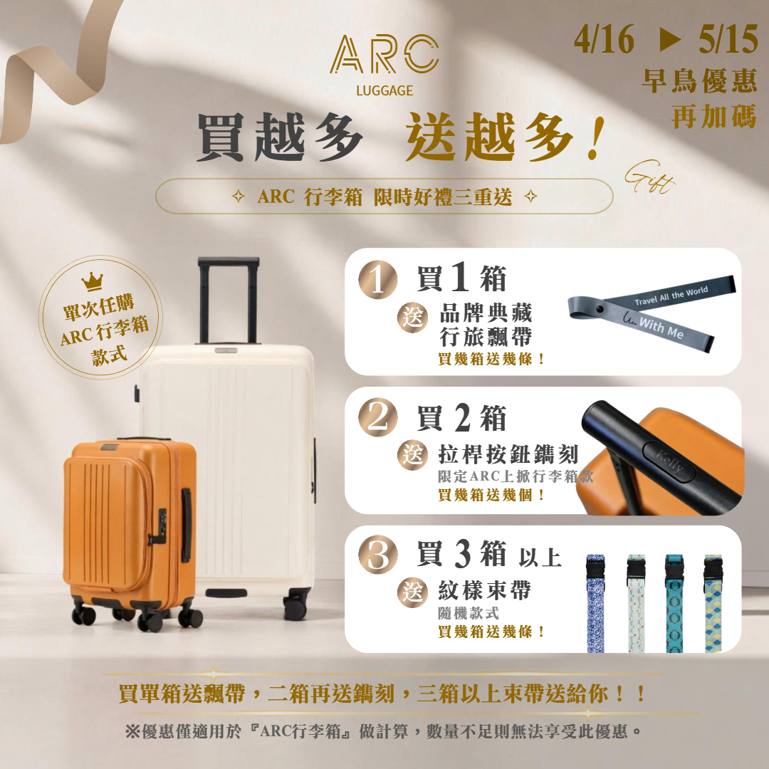 再買 NT$ 6079 即可享有 『單次任購ARC行李箱款式,送品牌典藏行旅飄帶。買幾箱送幾條!』* 1※優惠僅適用於「ARC行李箱」做計算,數量不足則無法享受此優惠。